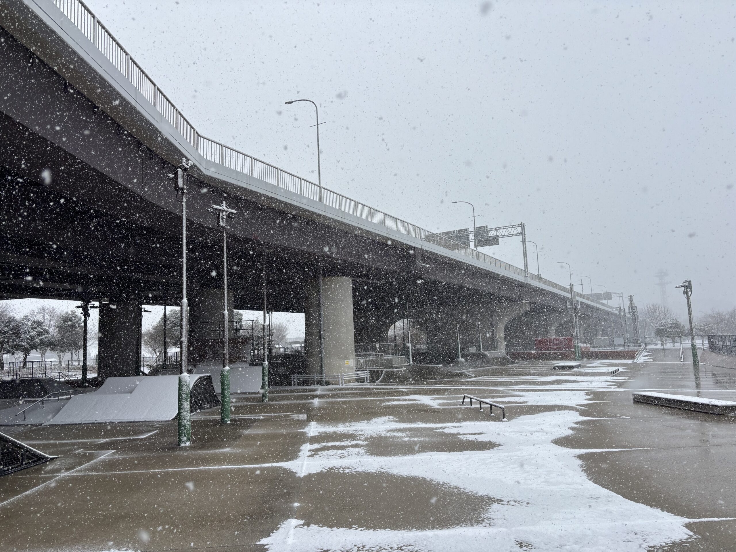 2月8日(日)10:30現在は、降雪の影響に伴い、路面凍結等の恐れがある為、新横浜公園スケボー広場は閉鎖継続中となります。